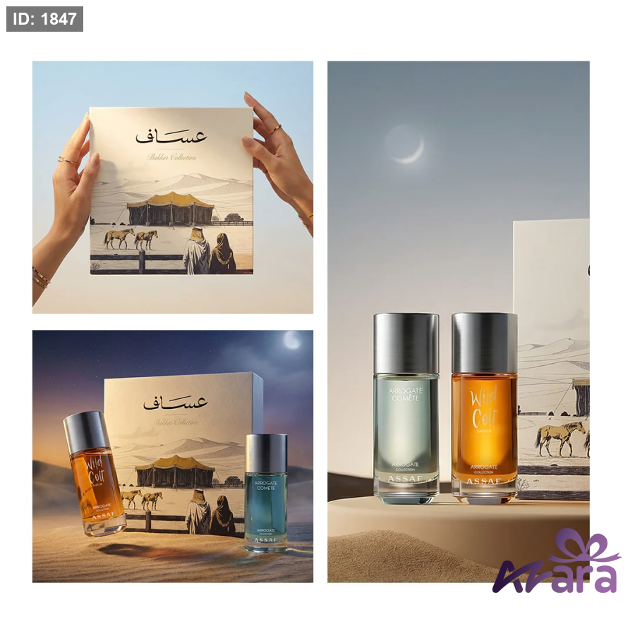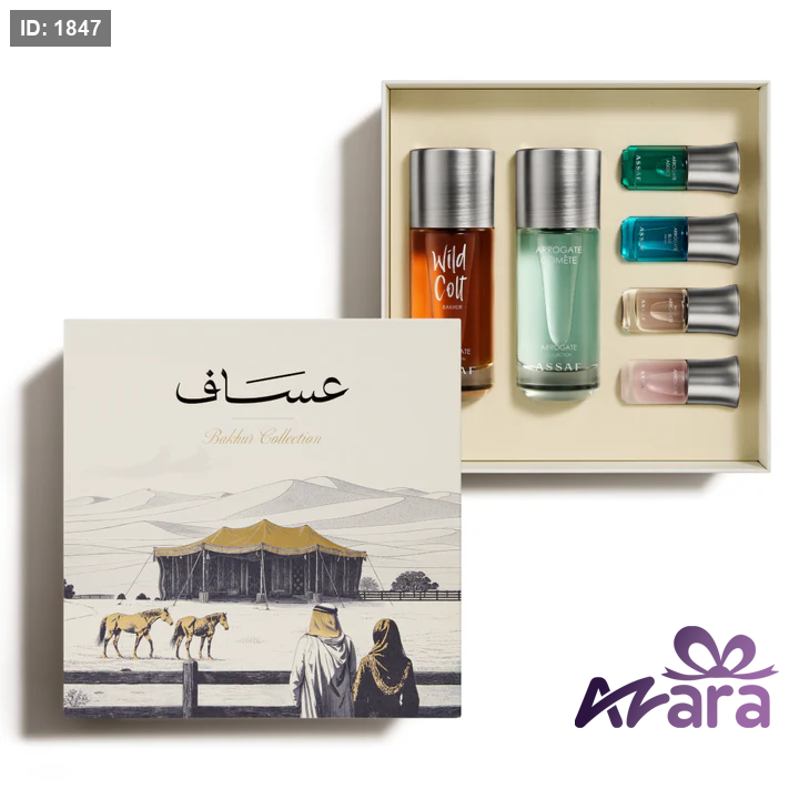 • Wild Colt Bakhur — 150 ML• Aroqat Comet Perfume — 150 ML• 4 × Mini Perfumes — 10 ML each• 4 × Elegant Gift Bags